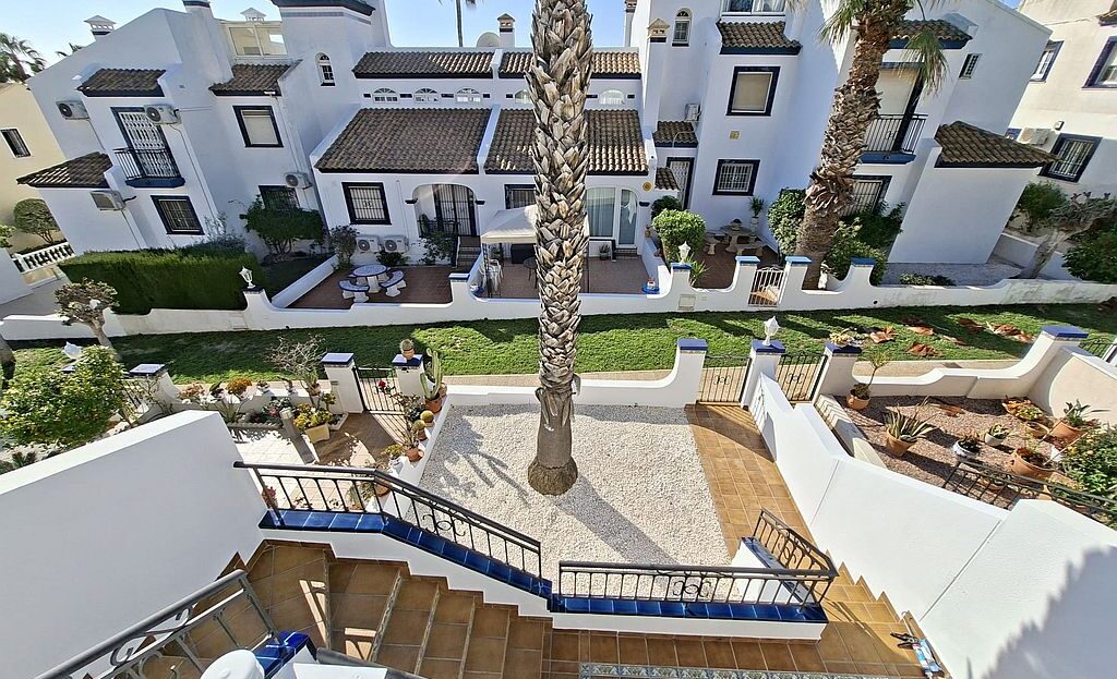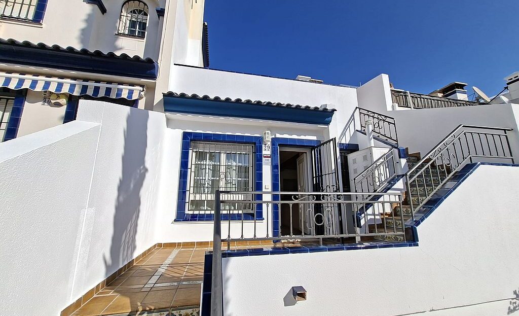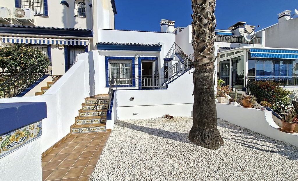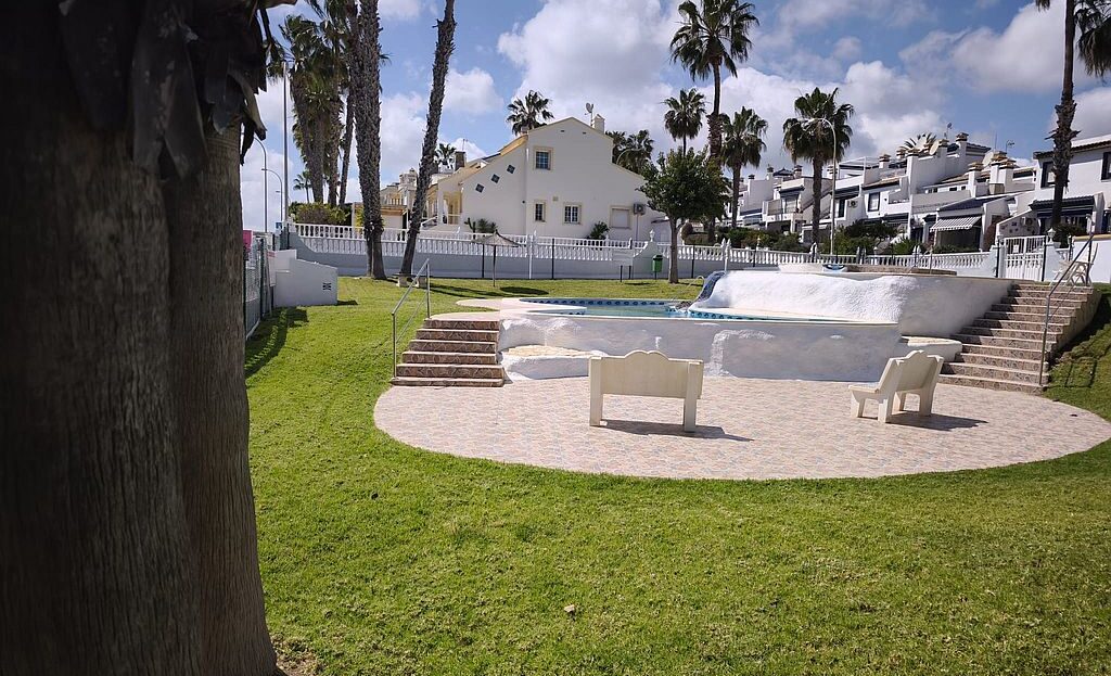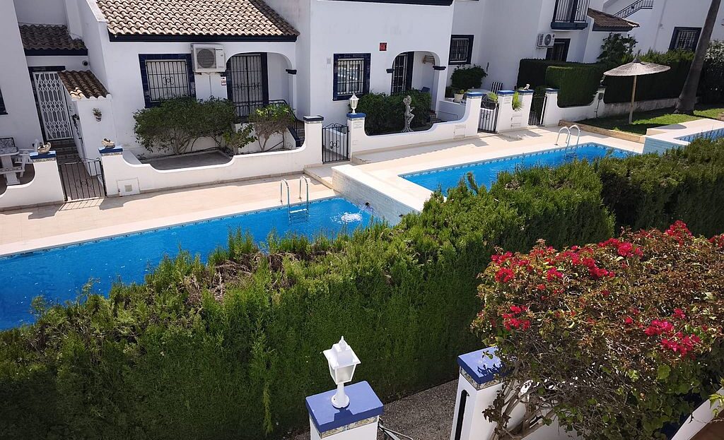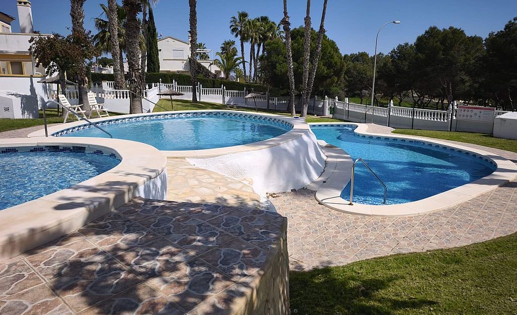 Beautifully presented Bungalow in La Rioja, Villamartin close to all amenities. This 2 bedroom 1 bathroom bungalow is sold fully furnished and has recently been updated. It has an open plan living area and an American style kitchen. It benefits from gardens to the front and back of the property, a terrace and a private solarium with sea views. There are 2 community pools to enjoy and is a walking distance to La Rioja, Los Dolses and La Fuente commercial centres. It has air condition to the main living area and ceiling fans in both bedrooms. La Zenia boulevard Commercial Centre is a 5 minutes’ drive away, as well as La Zenia Beach. Both Alicante and Murcia airports are within an hour’s drive.