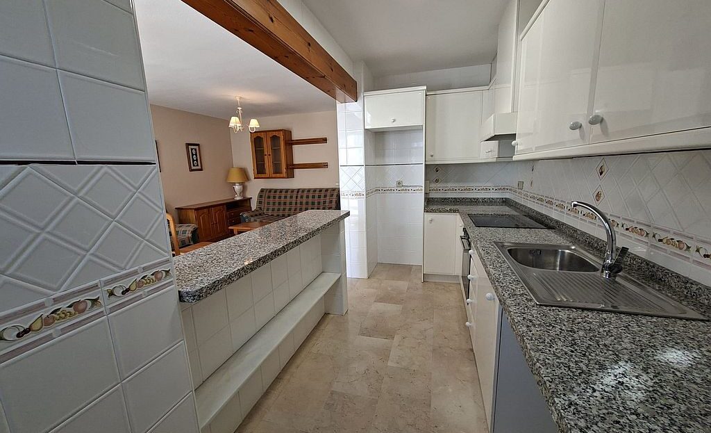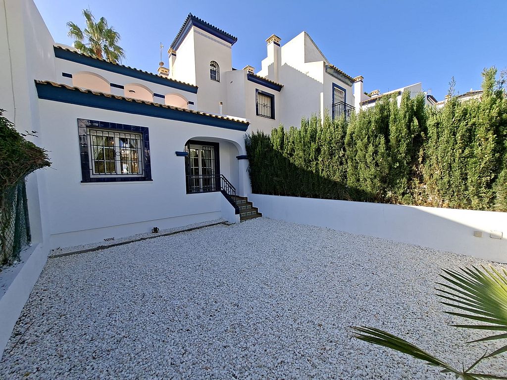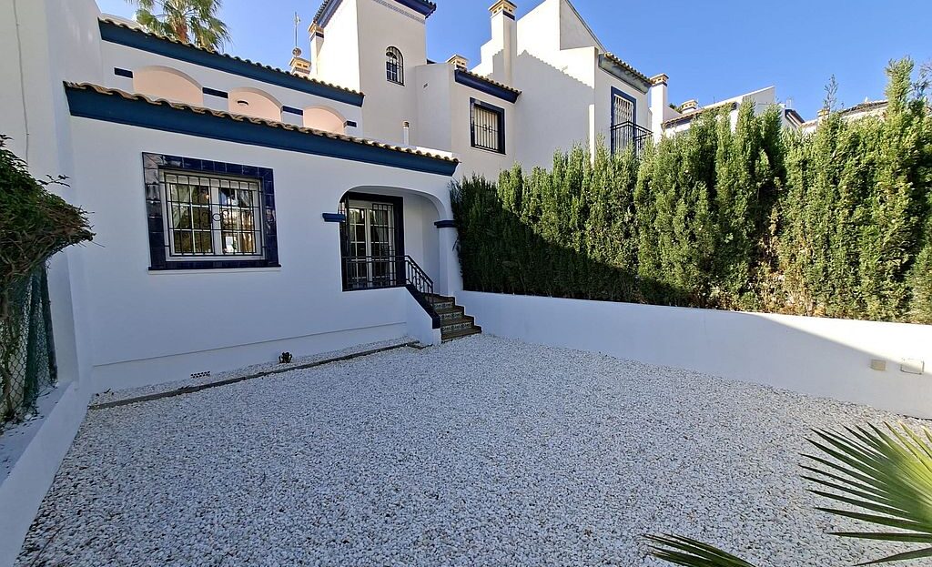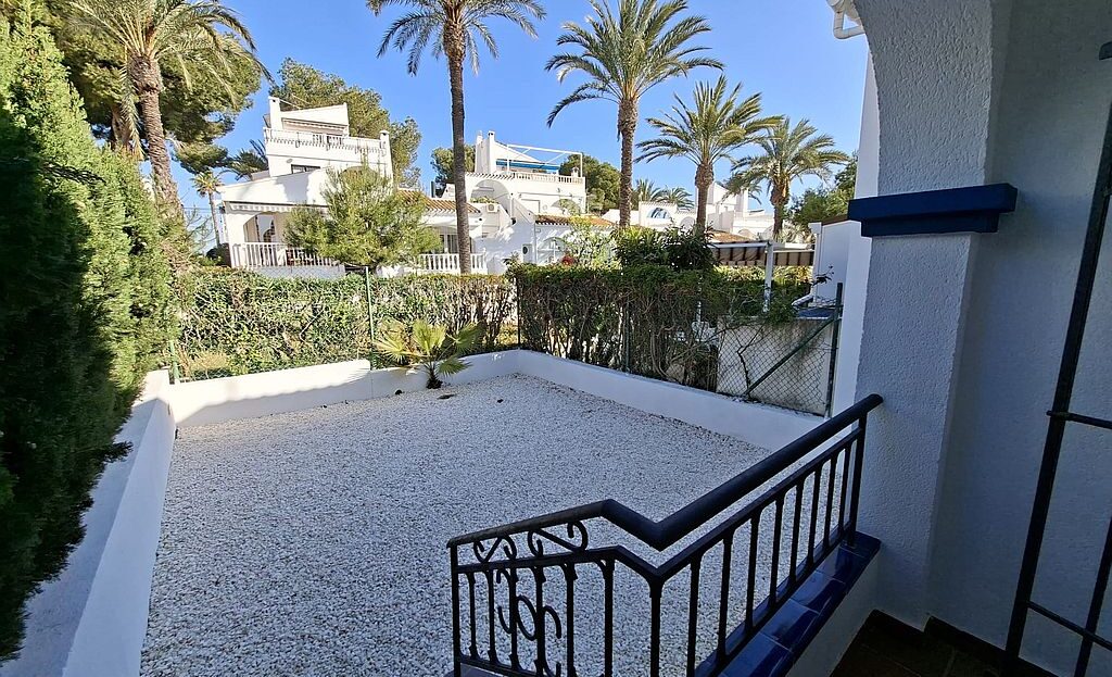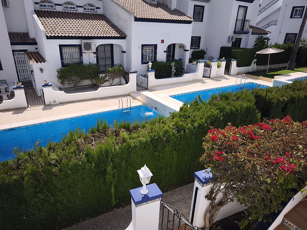 Beautifully presented Bungalow in La Rioja, Villamartin close to all amenities. This 2 bedroom 1 bathroom bungalow is sold fully furnished and has recently been updated. It has an open plan living area and an American style kitchen. It benefits from gardens to the front and back of the property, a terrace and a private solarium with sea views. There are 2 community pools to enjoy and is a walking distance to La Rioja, Los Dolses and La Fuente commercial centres. It has air condition to the main living area and ceiling fans in both bedrooms. La Zenia boulevard Commercial Centre is a 5 minutes’ drive away, as well as La Zenia Beach. Both Alicante and Murcia airports are within an hour’s drive.