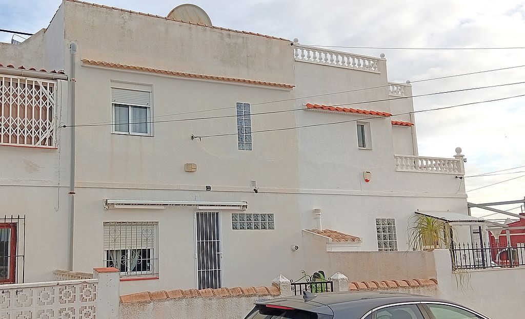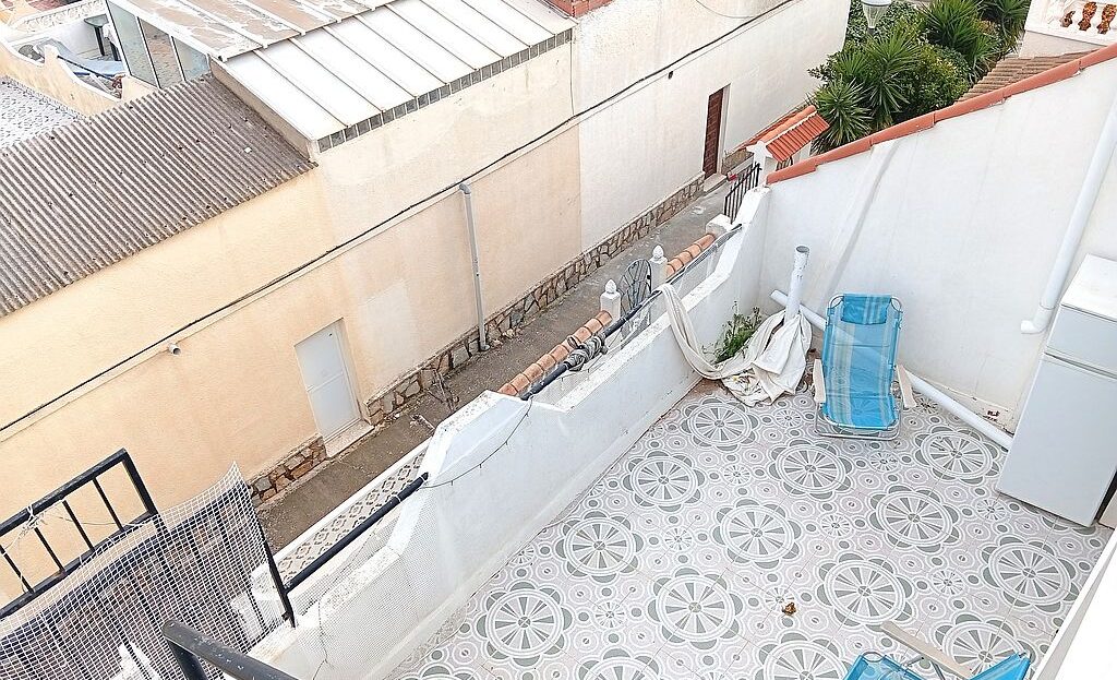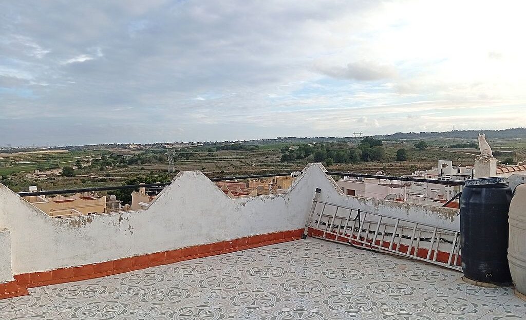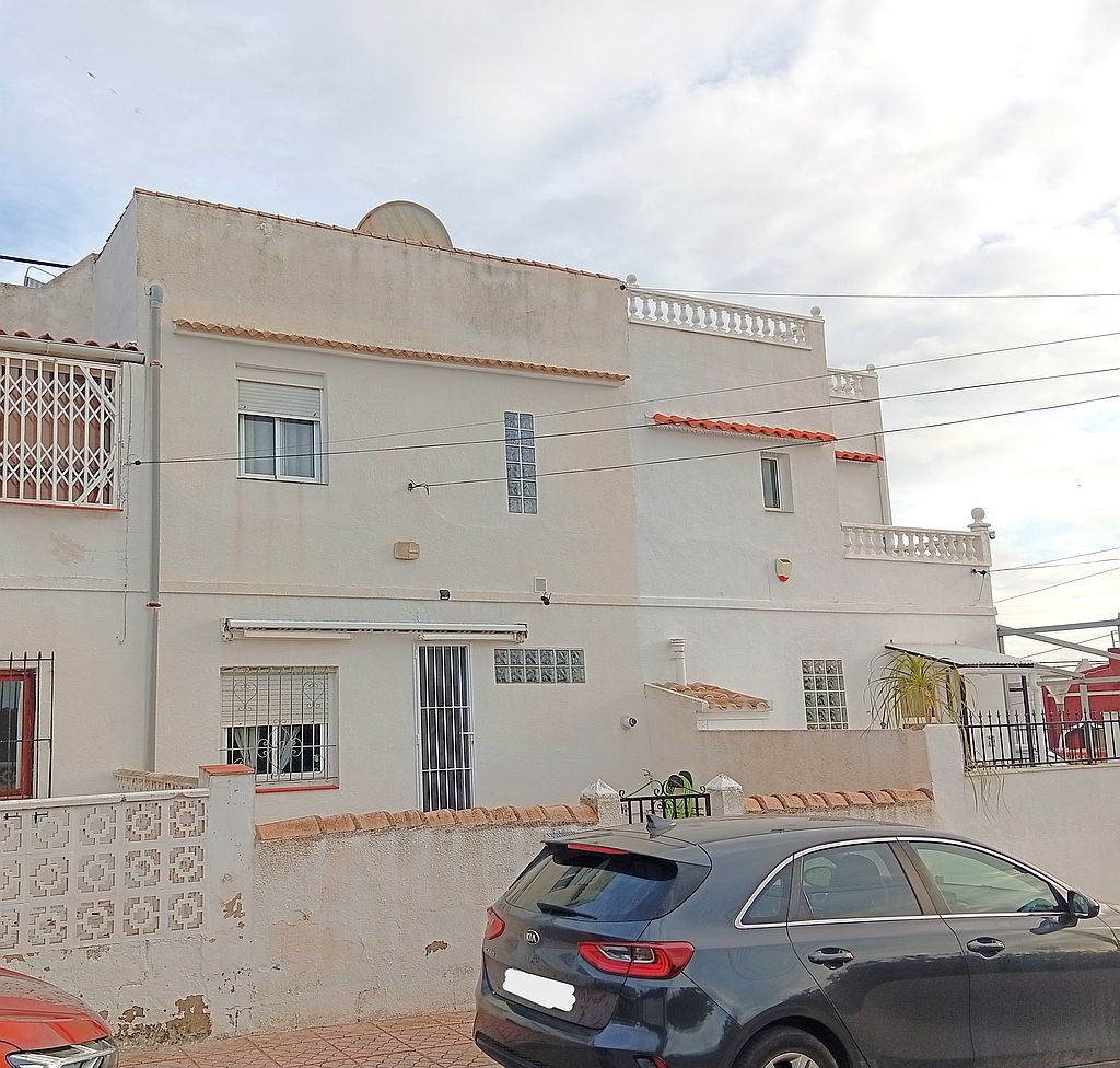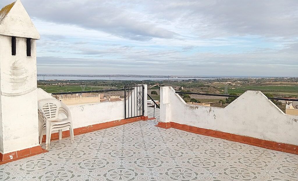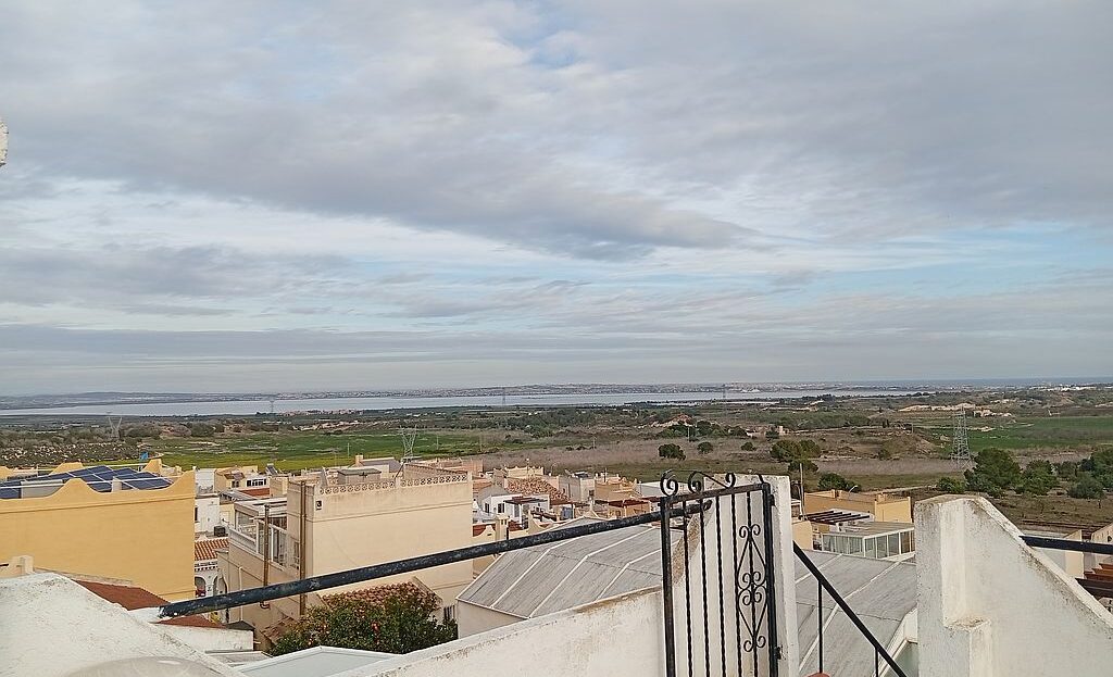Large Townhouse in San Miguel de Salinas in need of modernisation and renovation. The property has 4 bedrooms, 2.5 bathrooms, 2 tiled terraces ( front and back ), an open plan kitchen, 2 lounges and a private solarium with lake and distant sea views. On the ground floor you have the kitchen, 2 bedrooms, main bathroom, a lounge and stairs leading to the upstairs living area. Here are the other 2 bedrooms, lounge, bathroom and toilet, terrace and stairs leading to the solarium.