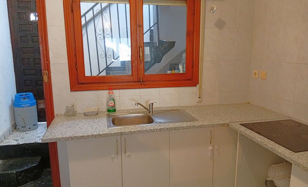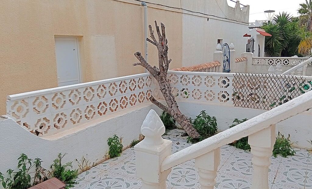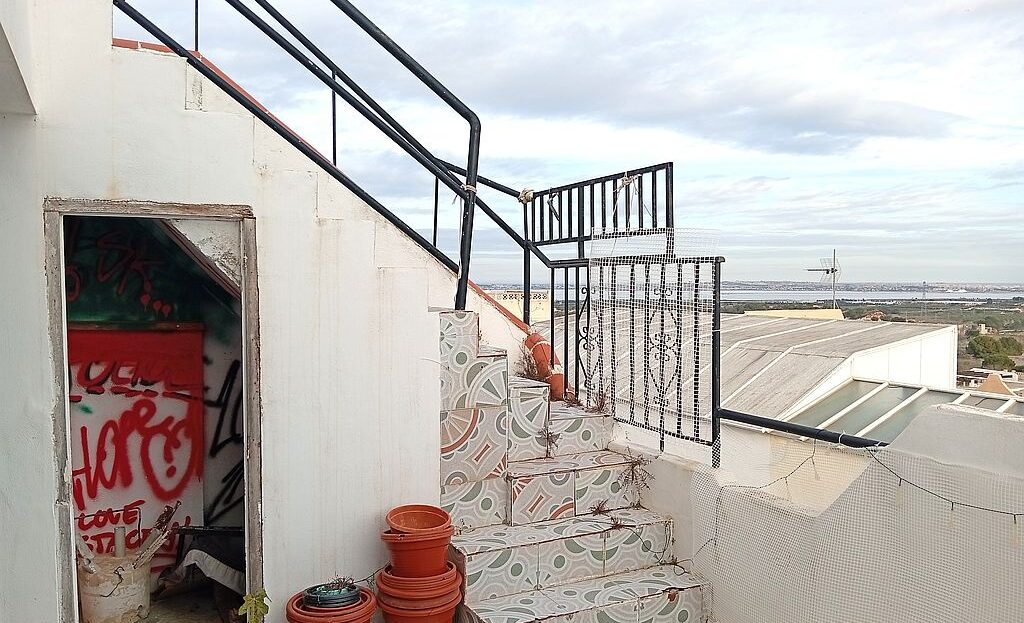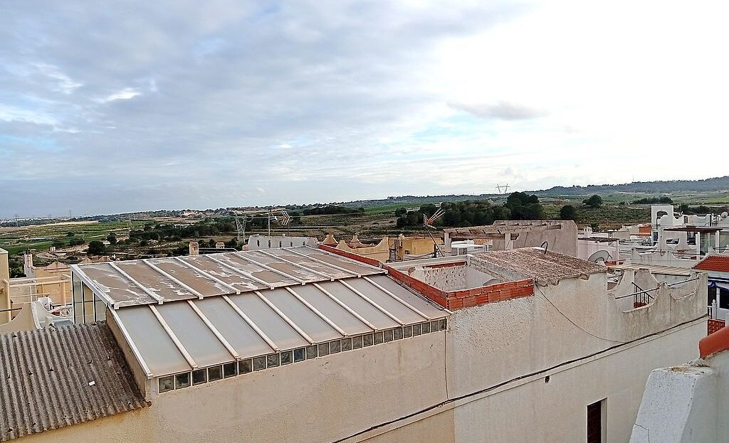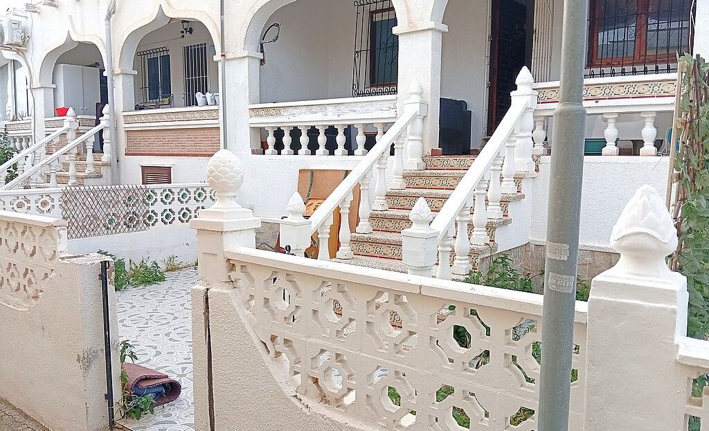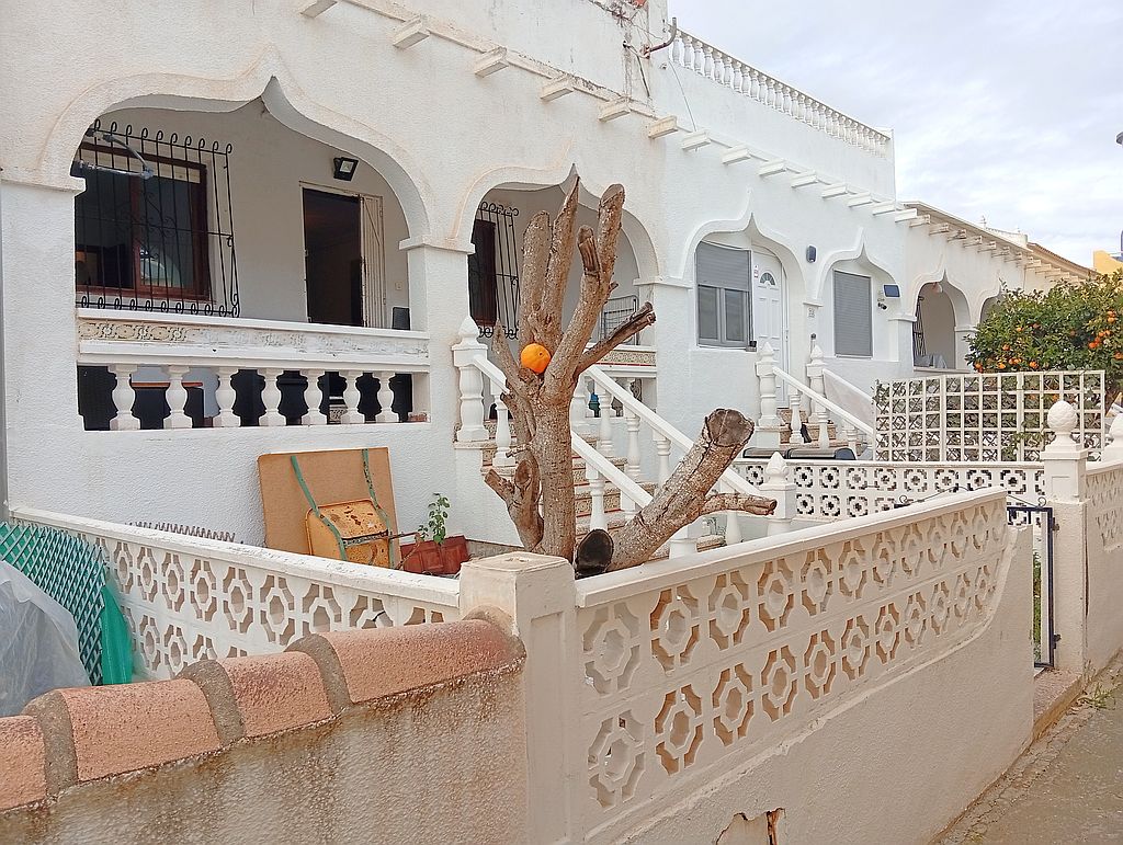 Large Townhouse in San Miguel de Salinas in need of modernisation and renovation. The property has 4 bedrooms, 2.5 bathrooms, 2 tiled terraces ( front and back ), an open plan kitchen, 2 lounges and a private solarium with lake and distant sea views. On the ground floor you have the kitchen, 2 bedrooms, main bathroom, a lounge and stairs leading to the upstairs living area. Here are the other 2 bedrooms, lounge, bathroom and toilet, terrace and stairs leading to the solarium.