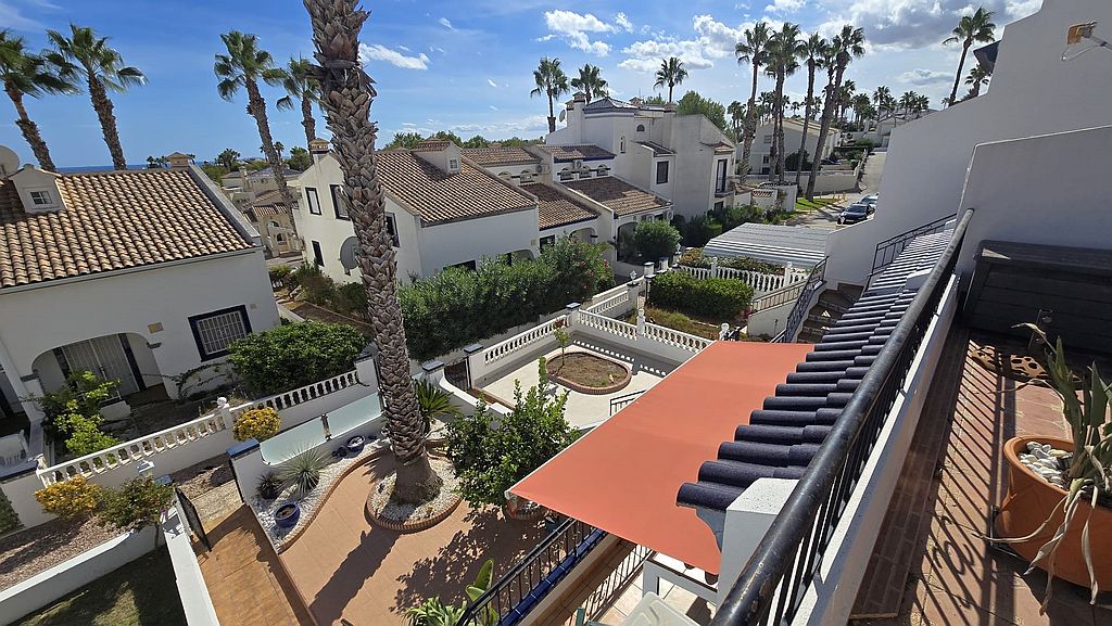 Villamartin terraced townhouse in great location with 3 bedrooms and 2 bathrooms and walking distance to Los Dolses and La Rioja Commercial Centre’s. The property has 3 terraces ( one that exits from the ground floor back bedroom, the second at the front door, and the third from the master bedroom upstairs ). The property benefits from its own private garden at the back, and has storage room under the front terrace at the front.